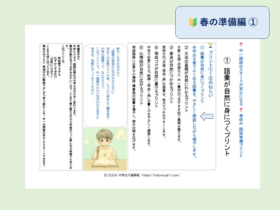 当サイトでは、新中1生応援企画として無料の国語のプリント集を公開しています。中1の国語でつまずきやすい「語彙・文法・読解・書く力・心情語」を、春休みのうちにやさしく整えられる5つのセットです。