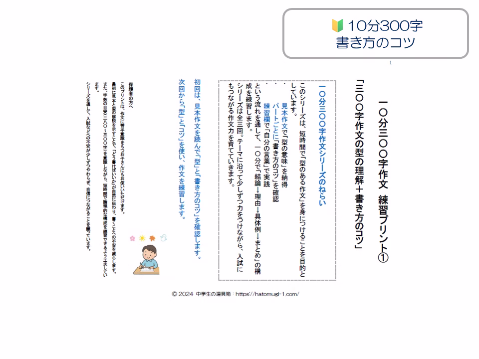 当サイトでは、つぎの内容をまとめた「作文の書き方プリント」を無料で提供しています。作文が苦手な人、問題集に取り組むのが不安な人、「型」に興味がある人におすすめします。